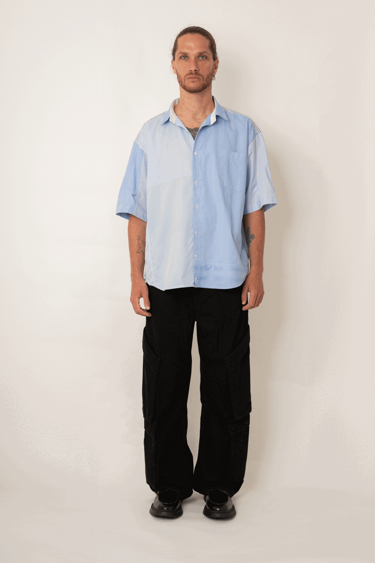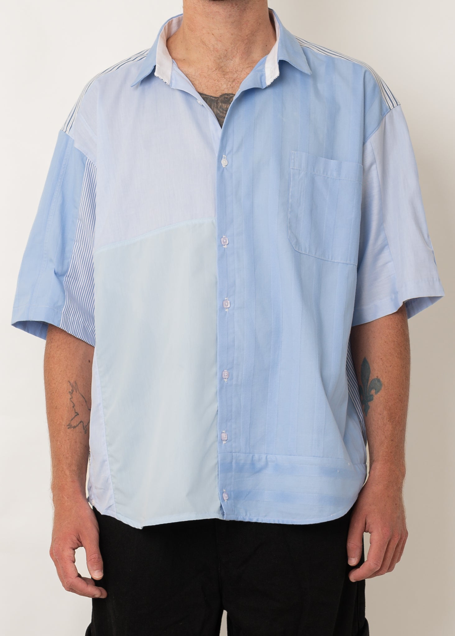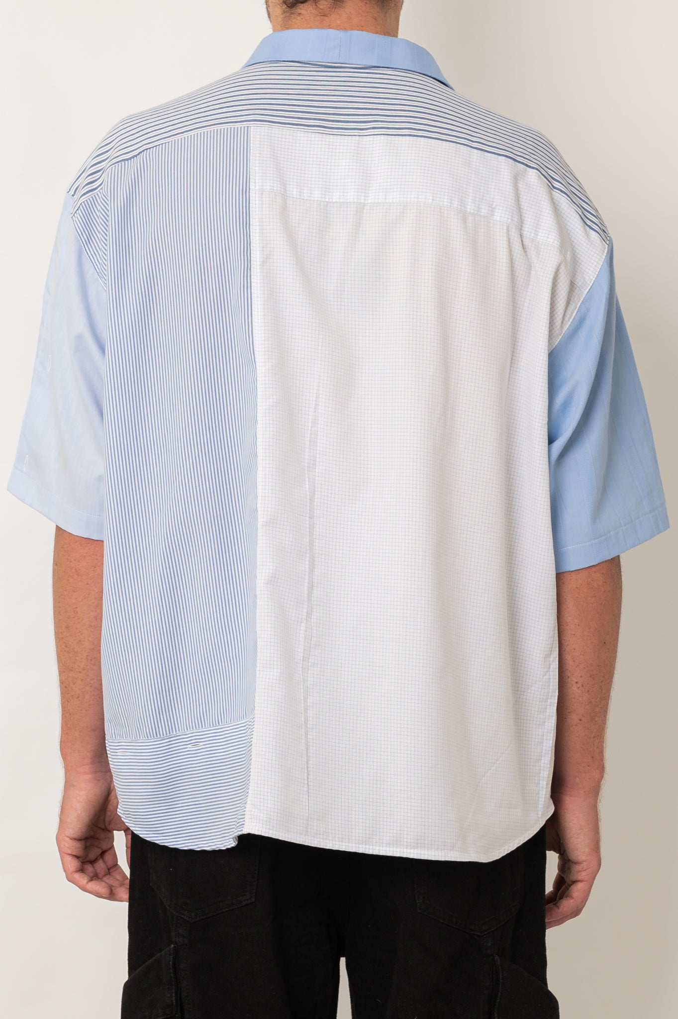 Introducing HELLO MY NAME IS BLUE – a shirt that blends shades and patterns into one cohesive masterpiece. The front showcases a harmonious mix of blue hues, featuring subtle striped details and a functional chest pocket, perfect for a touch of practicality. Turn it around, and you’ll find an unexpected twist – a patchwork of stripes and light blue checks that resemble squared paper, adding a playful and distinctive flair to the back. But what truly sets this shirt apart? The buttons. A mix of classic shirt buttons and standout square-shaped buttons give it that extra dose of charm and individuality.