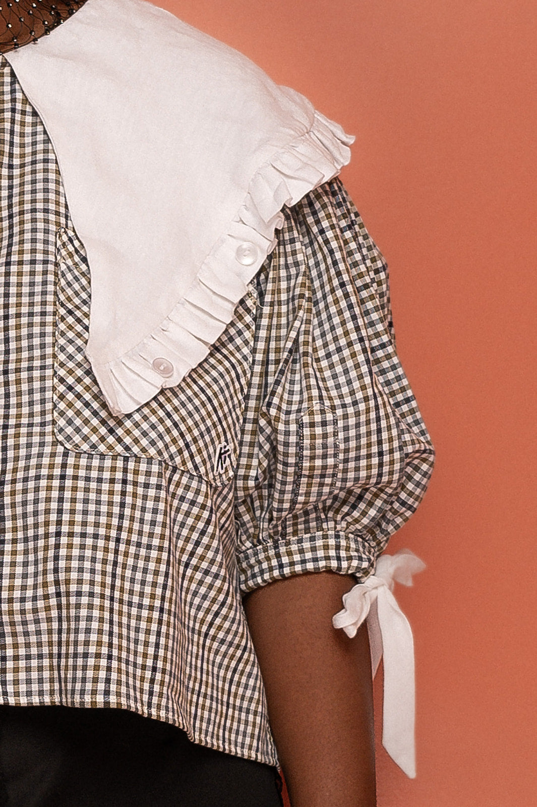 The top features short puff sleeves, adorned with white adjustable bows, allowing for versatile styling—cinch them tight for dramatic volume or let them loosen for a softer silhouette. The base of the blouse is a tailored shirt upcycled from an Aigle Men's cotton shirt in a timeless check print, balancing the oversized collar's playfulness with structured lines. A delightful harmony of idyllic charm and urban practicality, this blouse is perfect for making a statement in any setting.