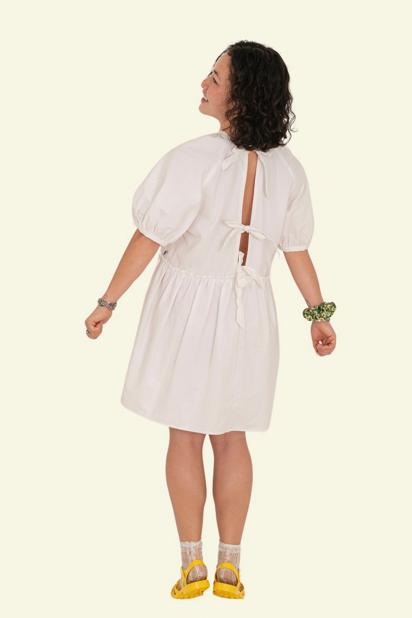 Look no further, the perfect blend of comfort and effortless style is this baby doll dress, upcycled from a bedsheet which ties in the back. Delaney (1m52) is wearing a size M.