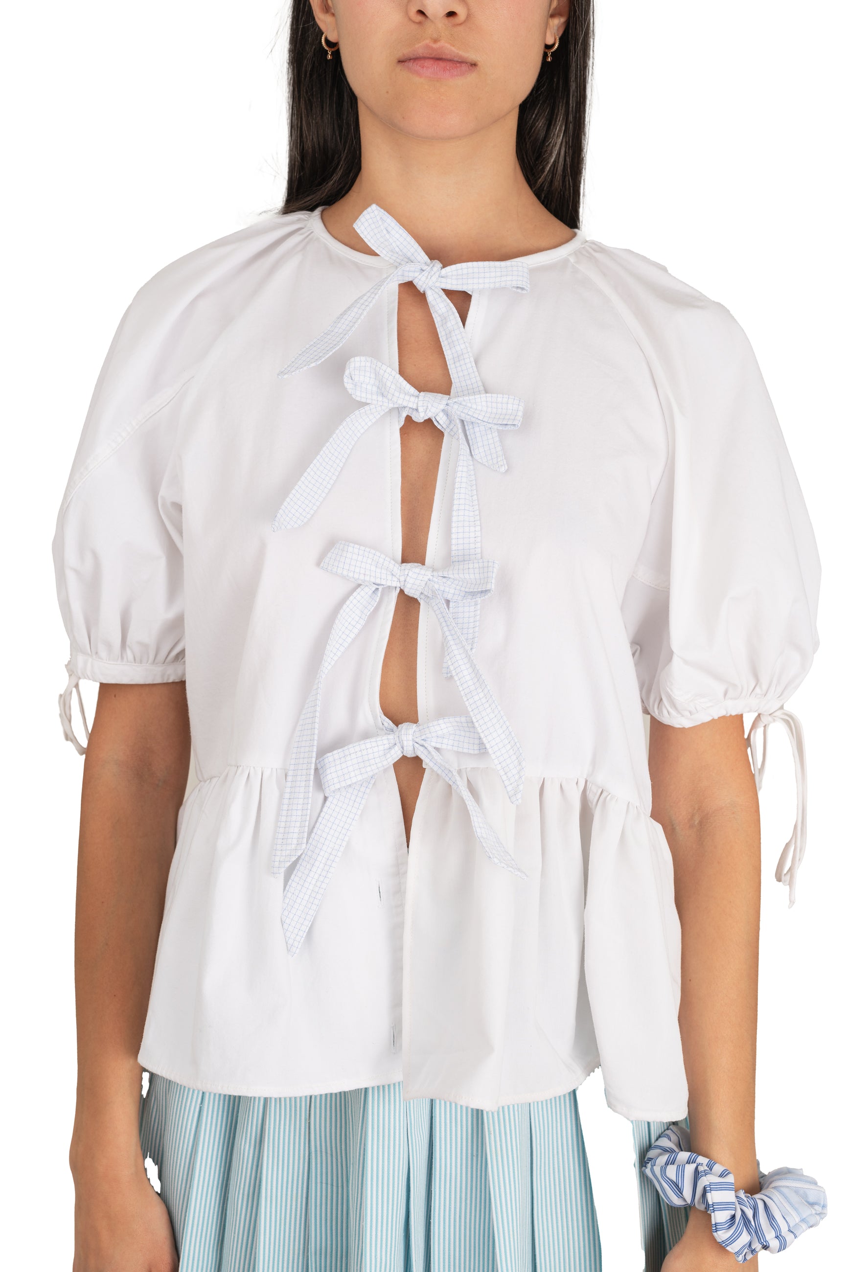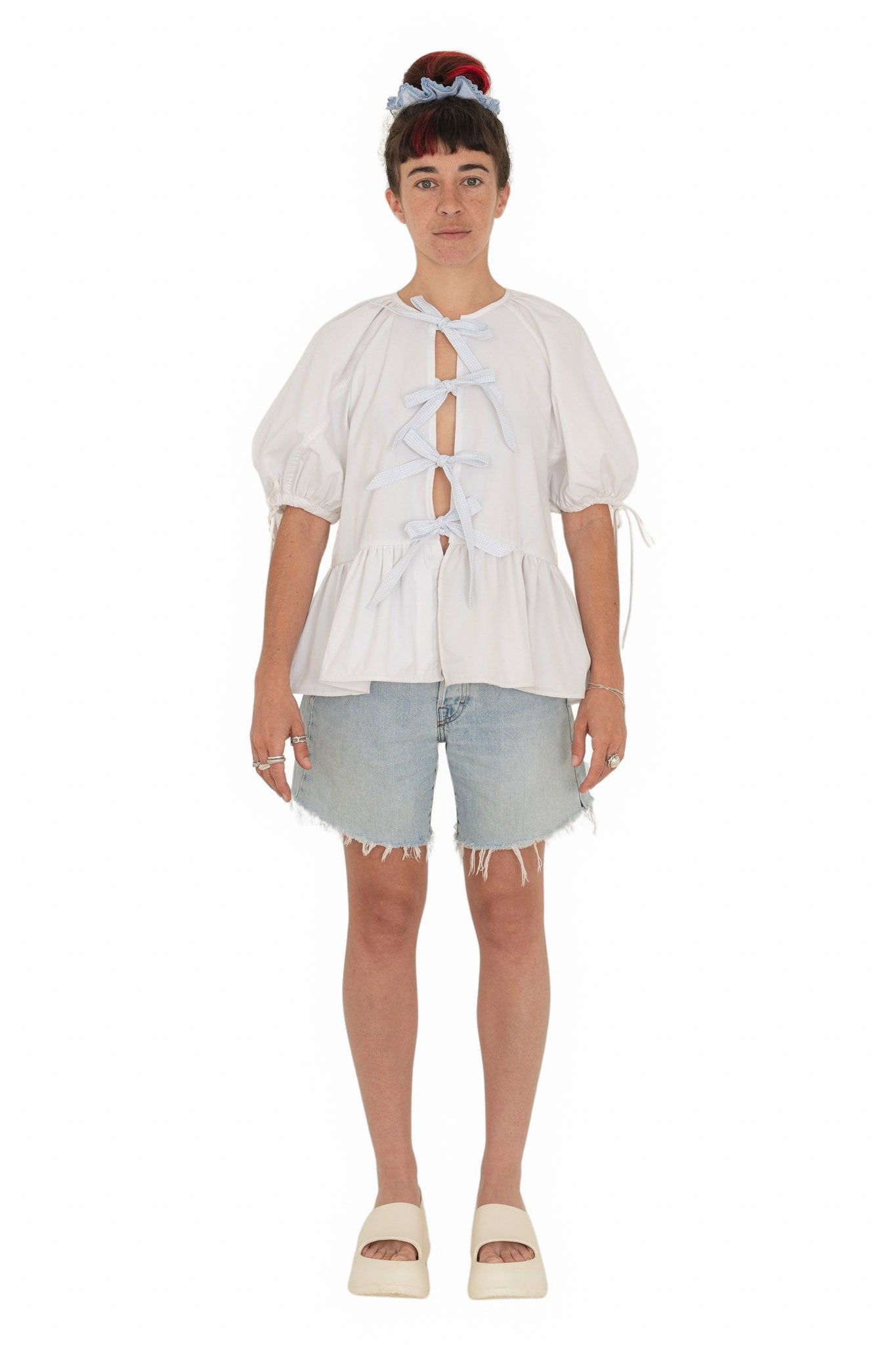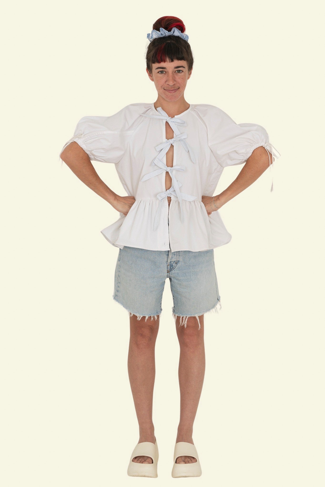 This sweet puff sleeve blouse is crafted from a mix of white men's cotton shirts with charming light blue scraps. The chunky front ties and thin white sleeve ties add a playful touch to this delight, perfect for any occasion!