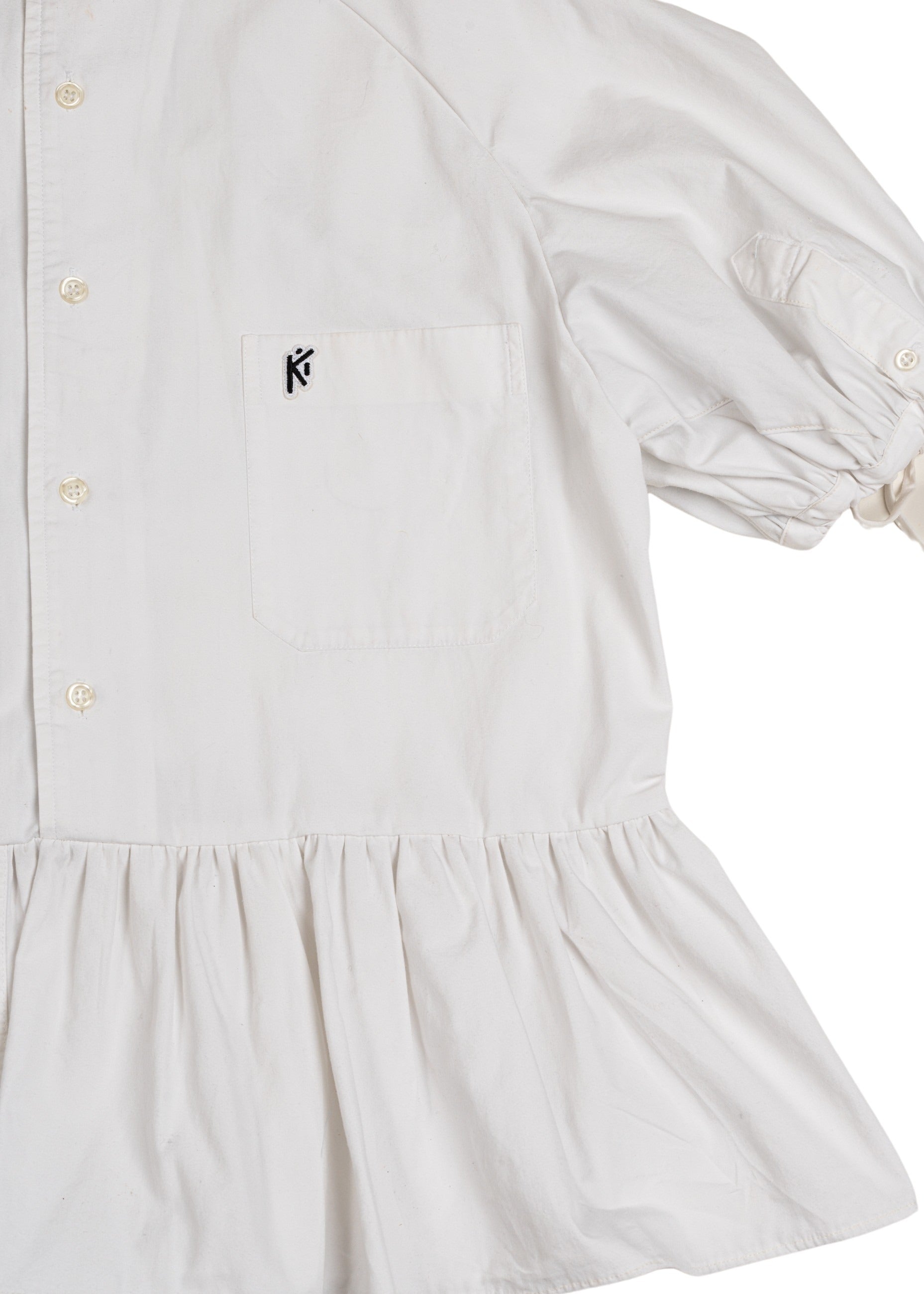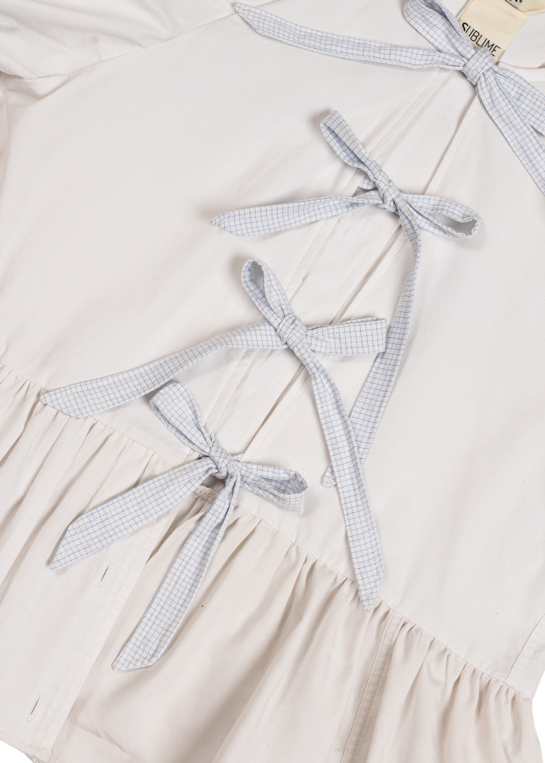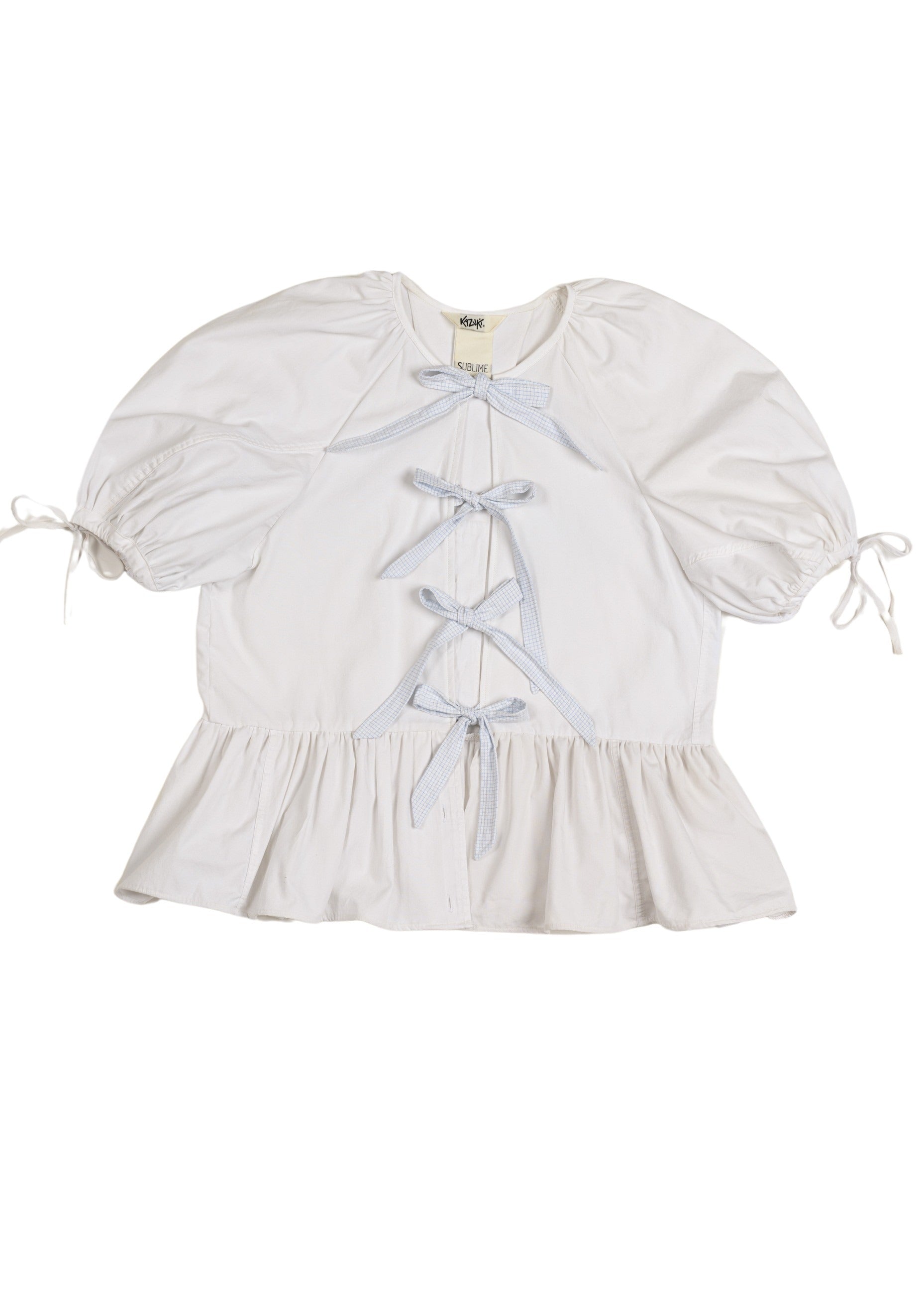 This sweet puff sleeve blouse is crafted from a mix of white men's cotton shirts with charming light blue scraps. The chunky front ties and thin white sleeve ties add a playful touch to this delight, perfect for any occasion!